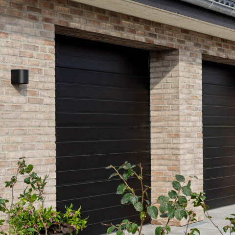Når garagen integreres 100% i husets arkitektur og i direkte forlængelse af selve huset bliver det umuligt at se hvor garagen stopper og huset begynder. Her er farveholdningen på de to store porte desuden afdæmpet så og i god harmoni med husets facade.
