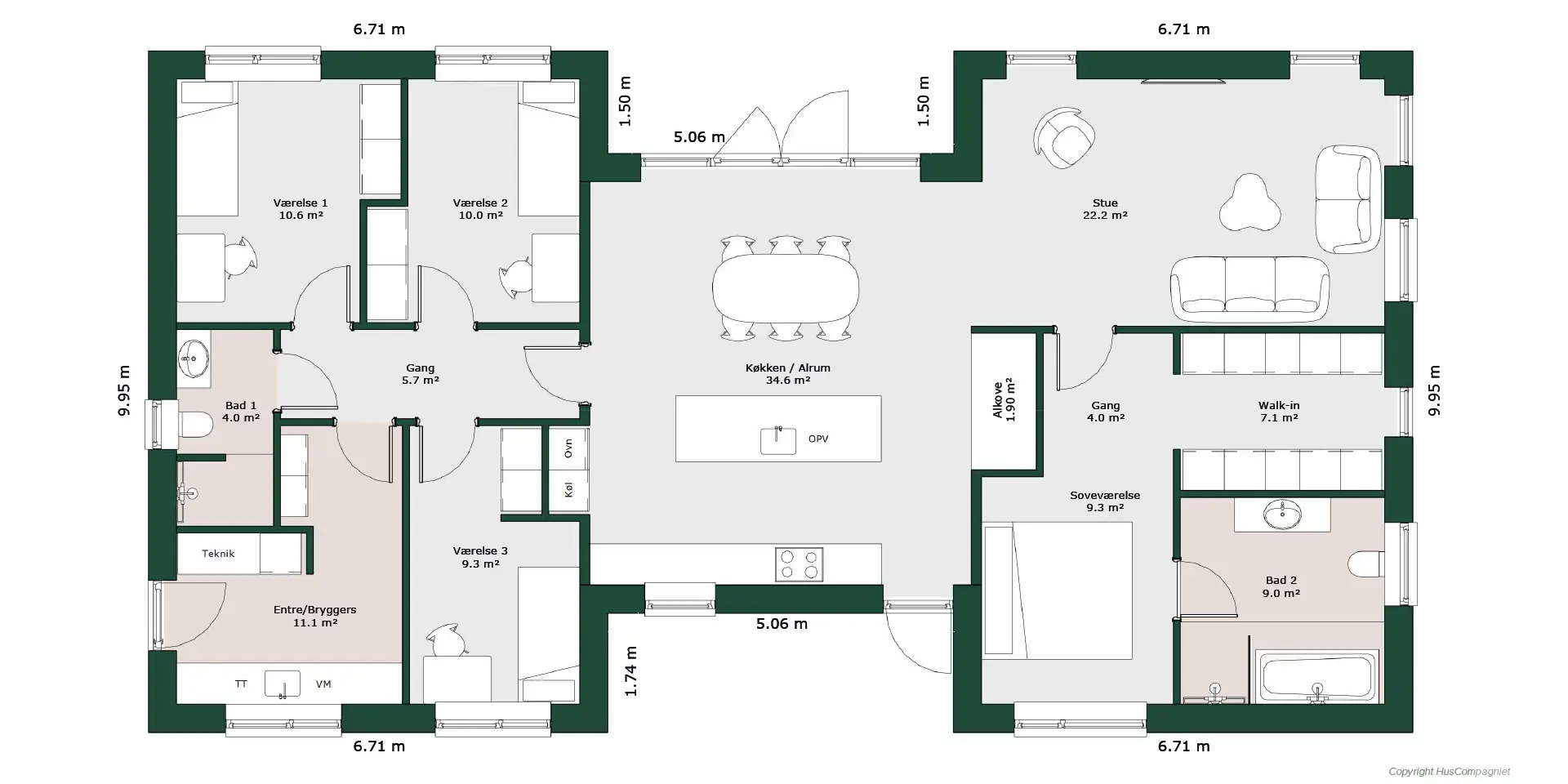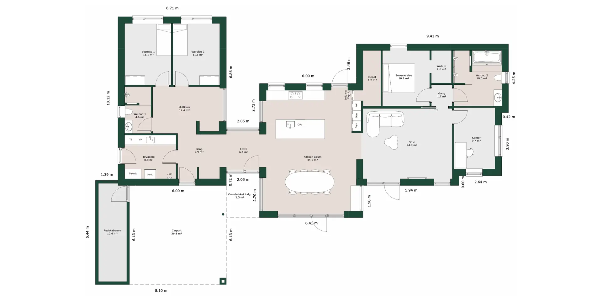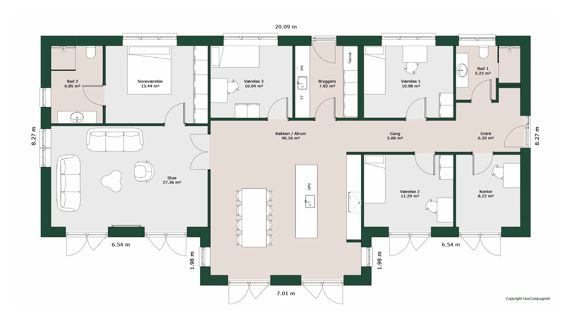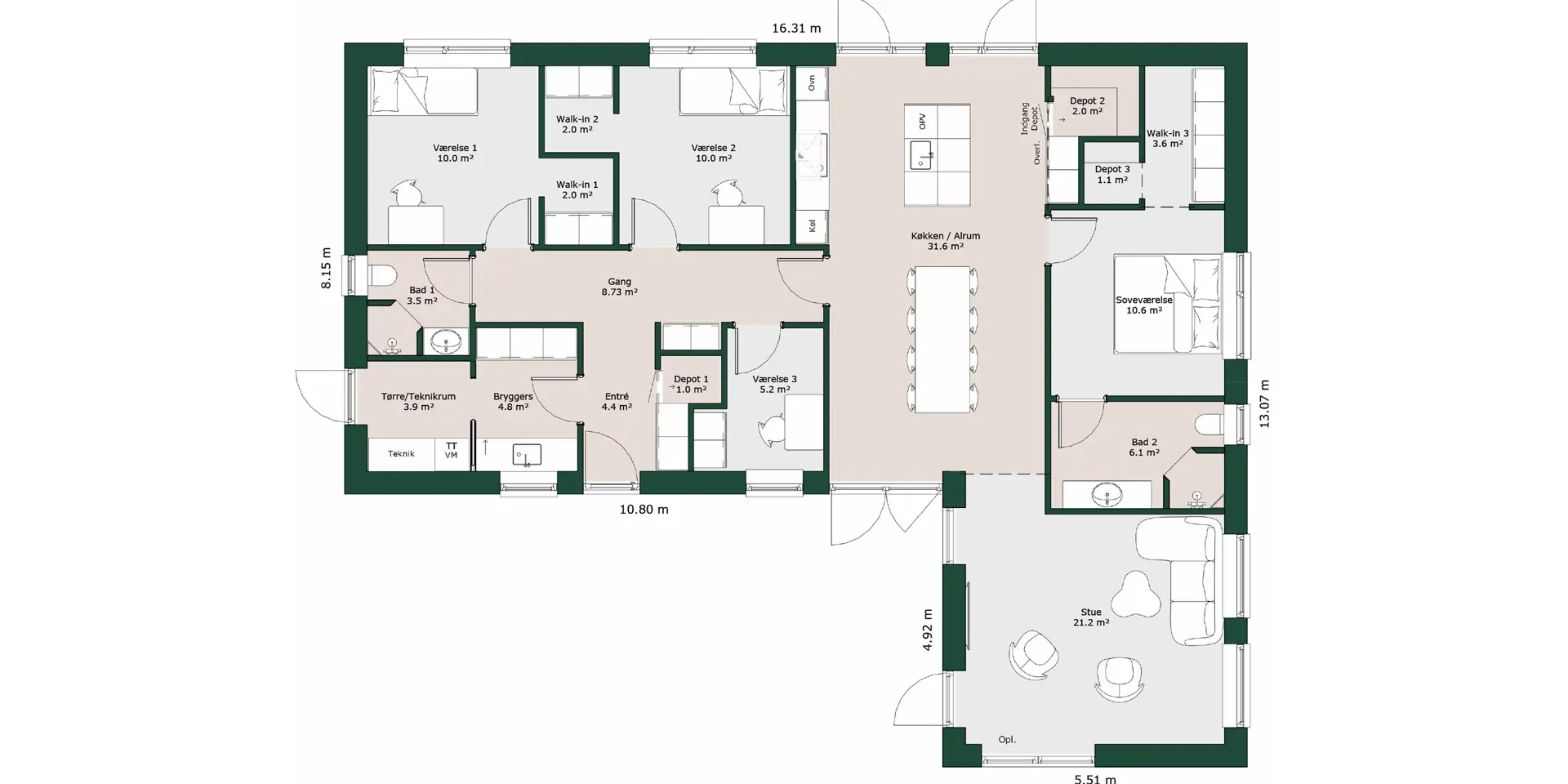H’et er bare formen på huset. Det betyder også, at du får en kompakt løsning, hvor der er oplagt mulighed for at inddele huset i afdelinger, og hvor der er god mulighed for terrasser på begge sider af huset.