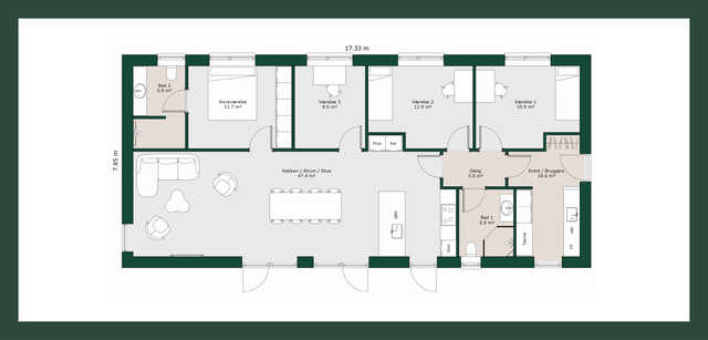 Typisk placeres et længehus i den ene side af grunden, så der bliver god plads til en stor have med direkte adgang fra terrassen. Her vil I have sol fra morgen til aften, hvis huset bliver placeret rigtigt på grunden.