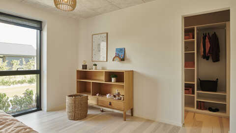 Fra stuen er der adgang til husets master bedroom hvor der er mange indbygningsskabe.