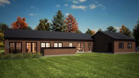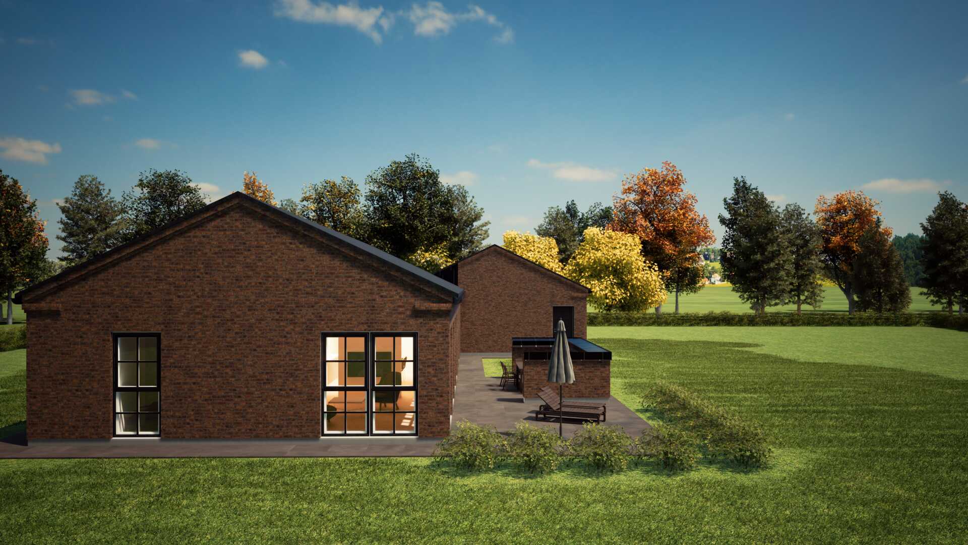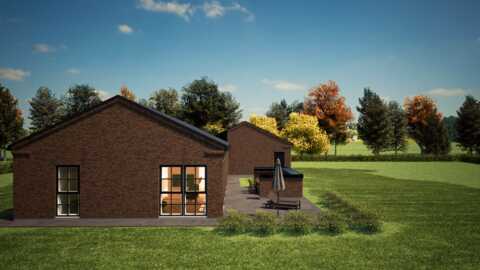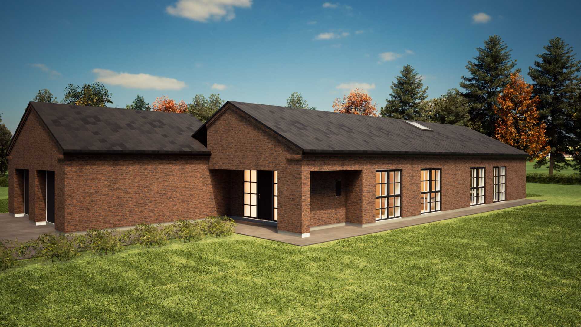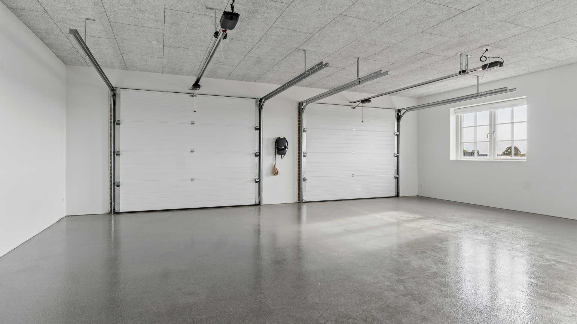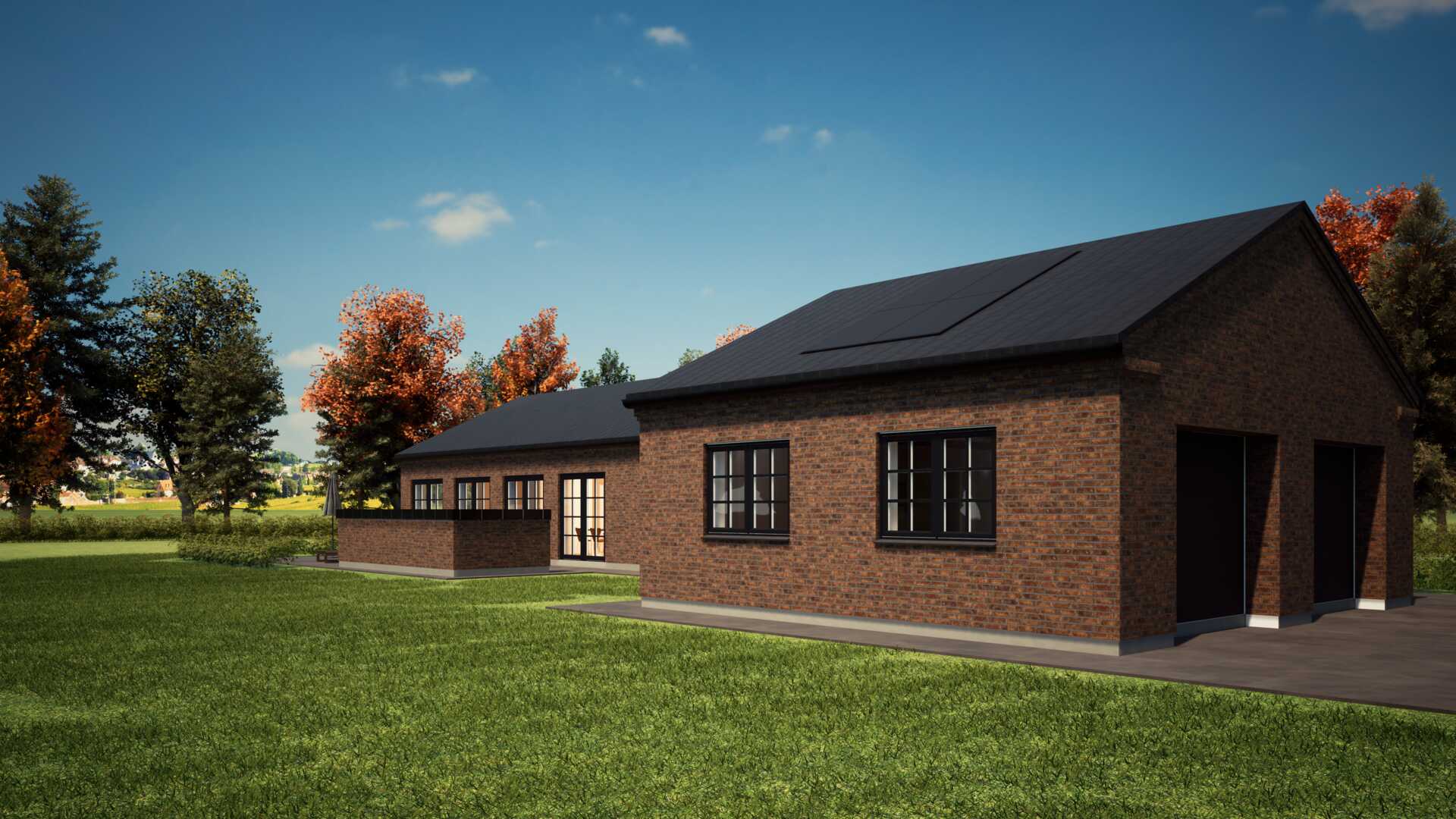 Garagen fuldender helheden med teknikskab, dobbelte porte og vinduer i stil med husets øvrige arkitektur og detaljer. Og hvor de brunrøde mursten leder tankerne hen på dansk byggetradition, skaber de sorte tagrender, zinkbeklædning og vinduesrammer en elegant kontrast.
