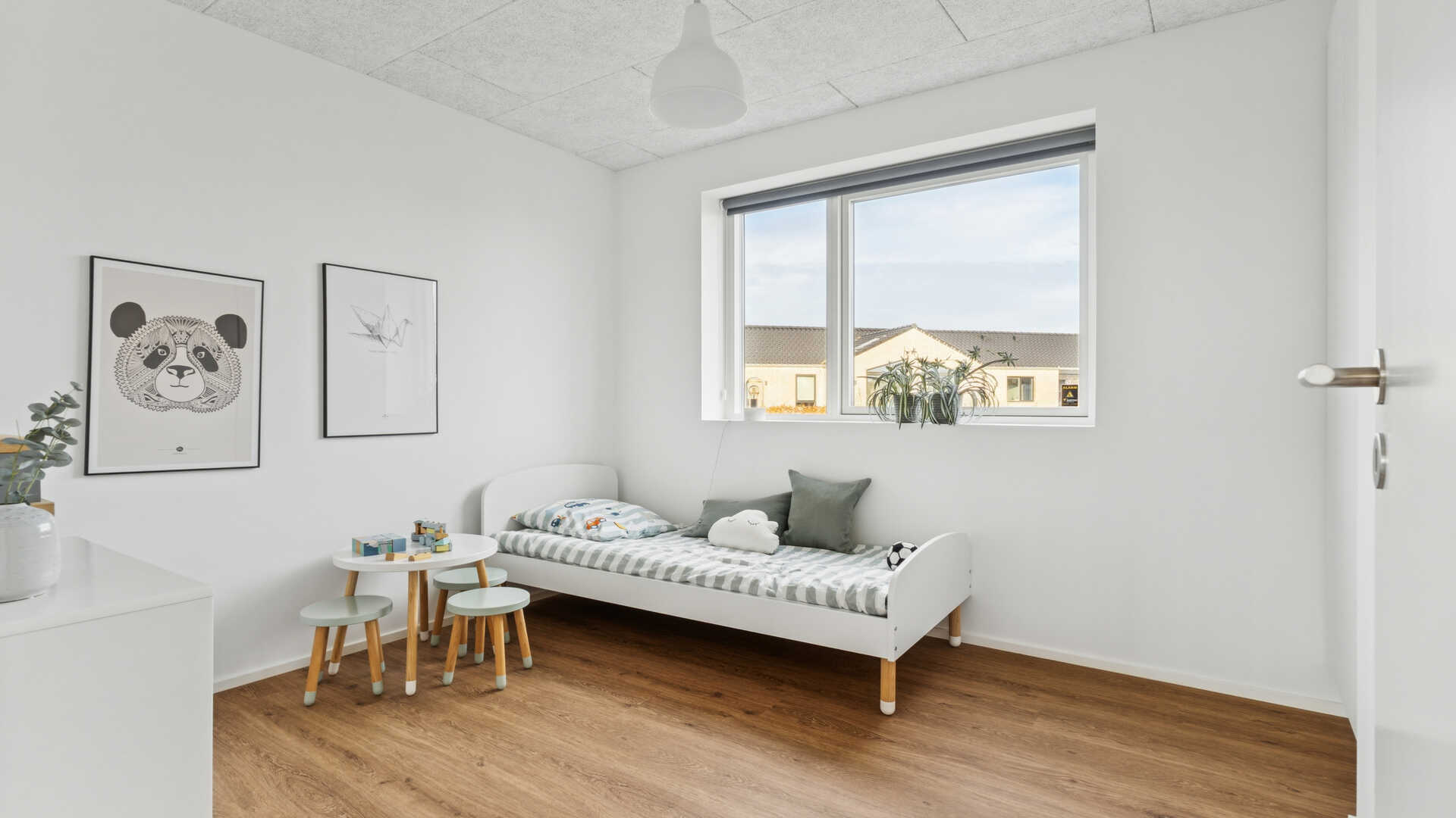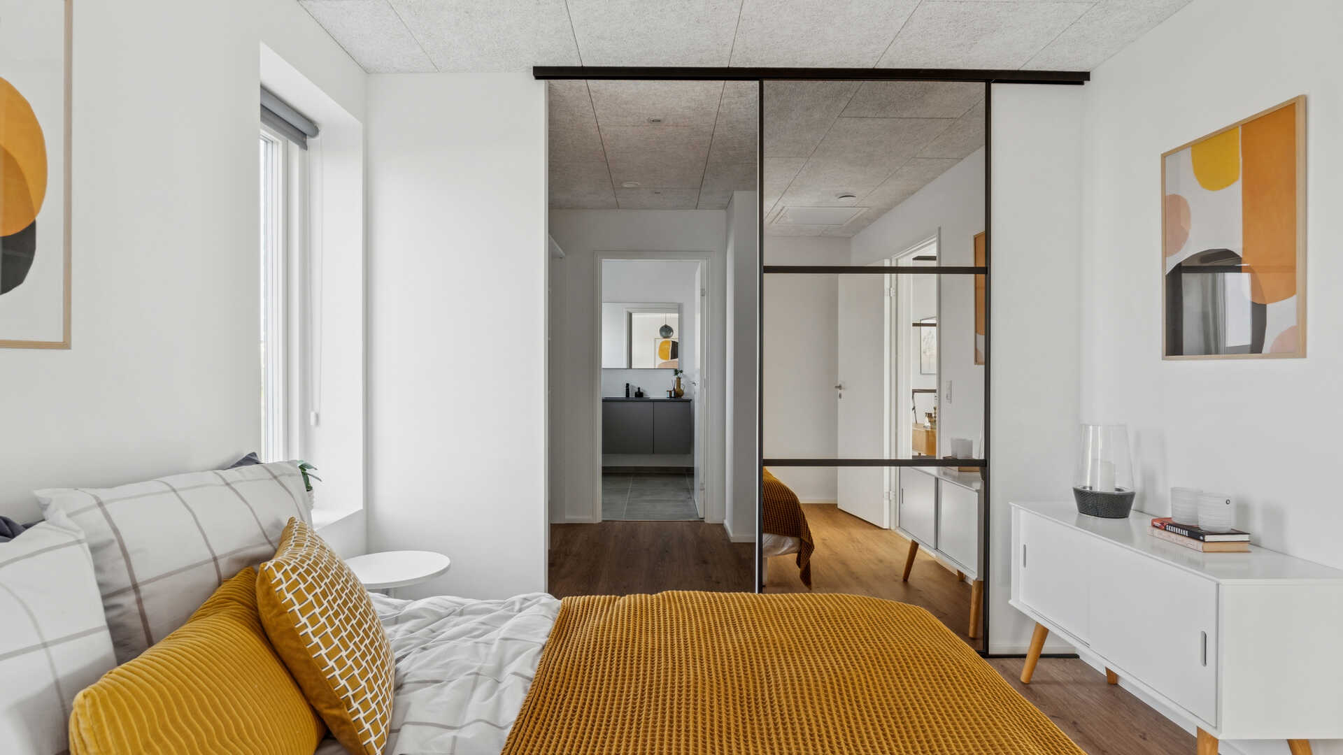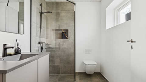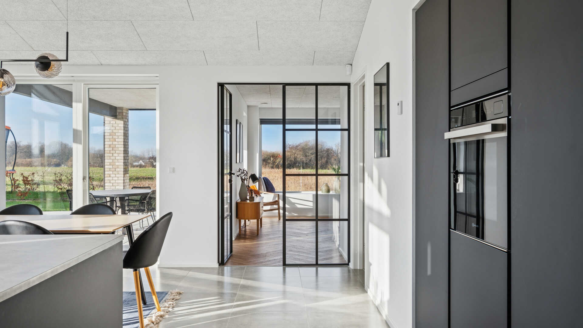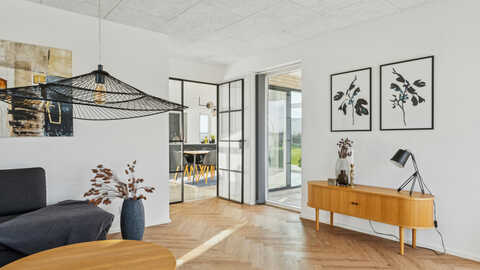 I entréen er der en garderobe-niche, med en muret væg af facadesten som en ekstra detalje. I køkken/alrummet finder man det populære skjulte depot gemt bag en skabslåge og på væggen bag kogepladen er der sorte glaserede fliser. Mellem køkken/alrum og stuen er der en dobbelt glasdør i New Yorker stil og i stuen er der en sansebænk med et panoramavindue.