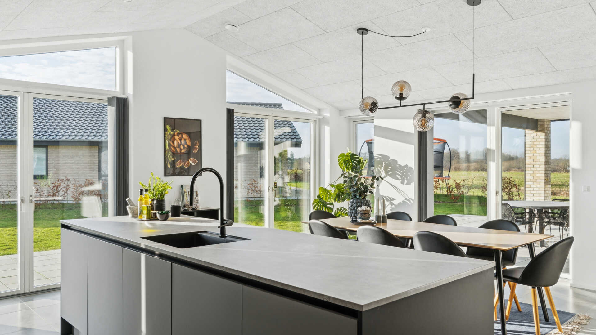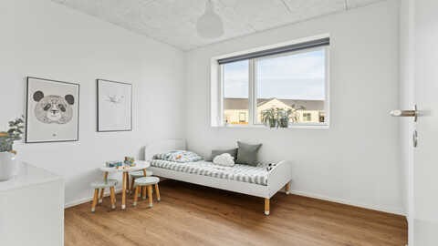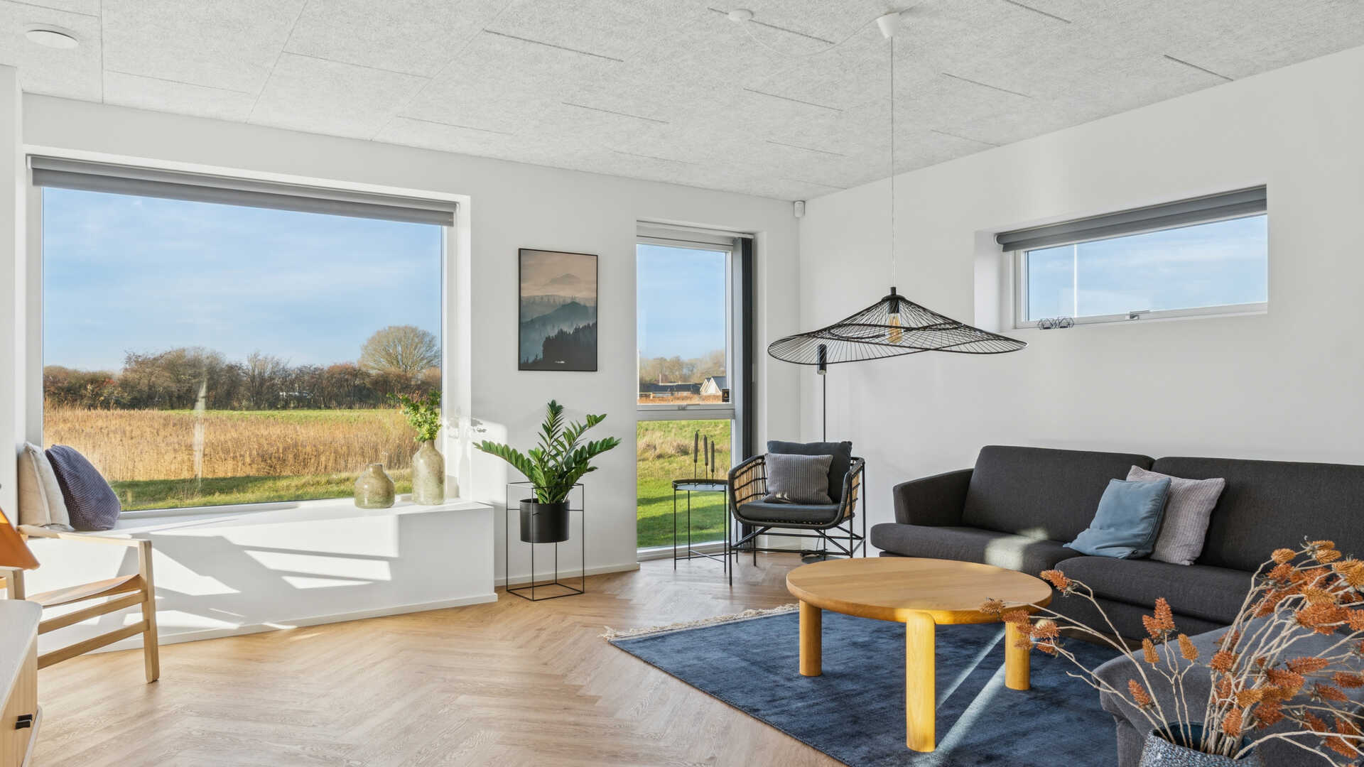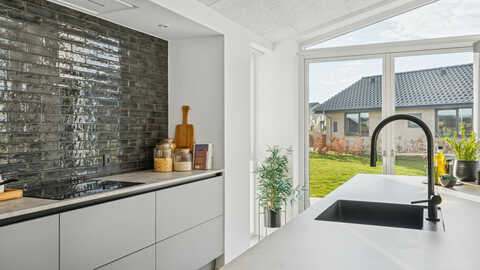 Køkken/alrum, overdækket terrasse og stuen er sydvestvendt med udsigt ud over åbne marker. Huset er muret med lyse blødstrøgne mursten med sort tegltag, sorte arkitekttagrender, sorte skotrender og sorte alu vinduer og døre fra Rationel. Huset opvarmes med fjernvarmebaseret gulvvarme.