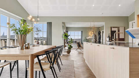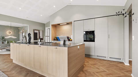 Husets naturlige samlingspunkt er det imponerende køkken-alrum, der ligger centralt placeret med åben forbindelse til stuen. Her får I et lyst og indbydende opholdsrum med direkte udgang til terrassen – perfekt til både hverdag og gæstebesøg.