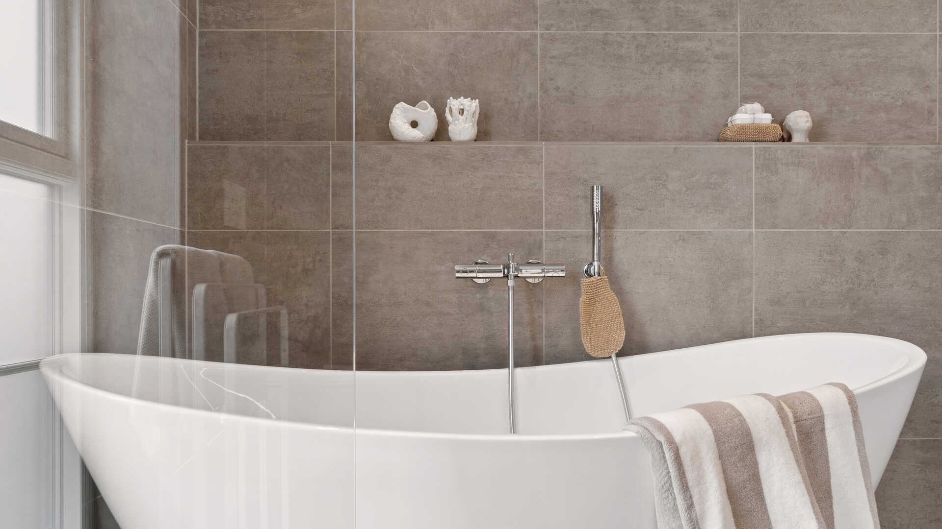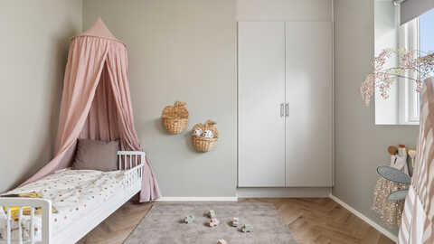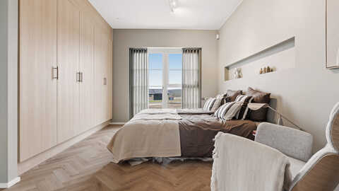 Forældreafdelingen er indrettet som en privat oase med stort soveværelse, praktisk skabsvæg og direkte adgang til terrassen. Hertil kommer et rummeligt badeværelse med både badekar og bruseniche.
