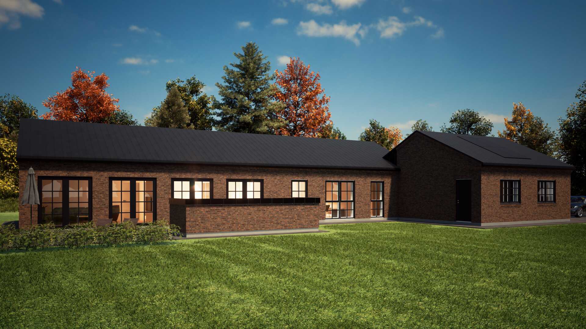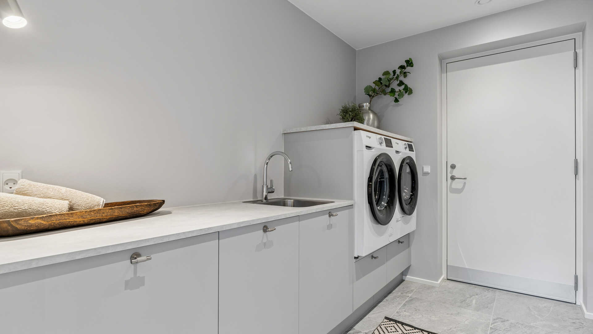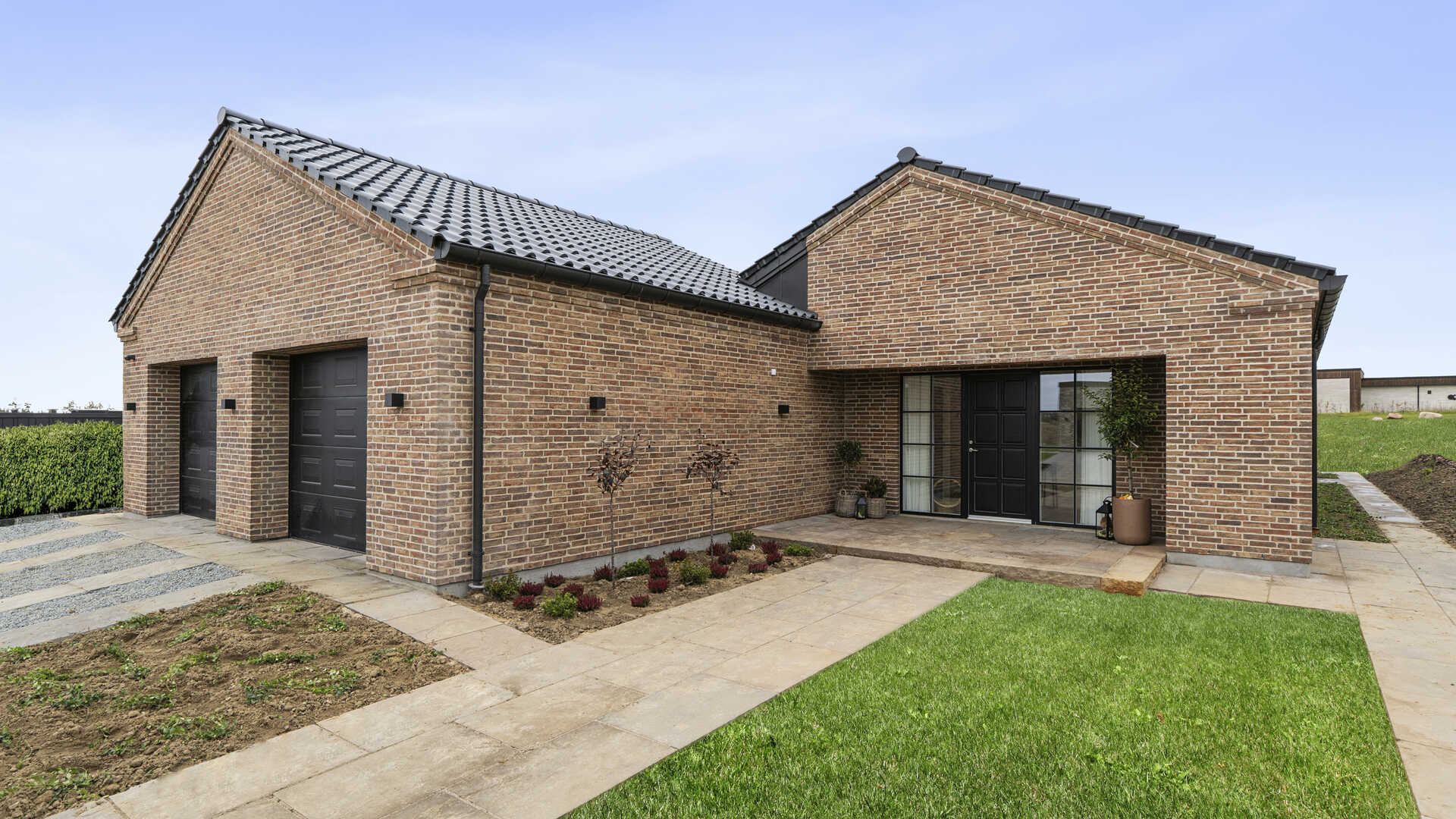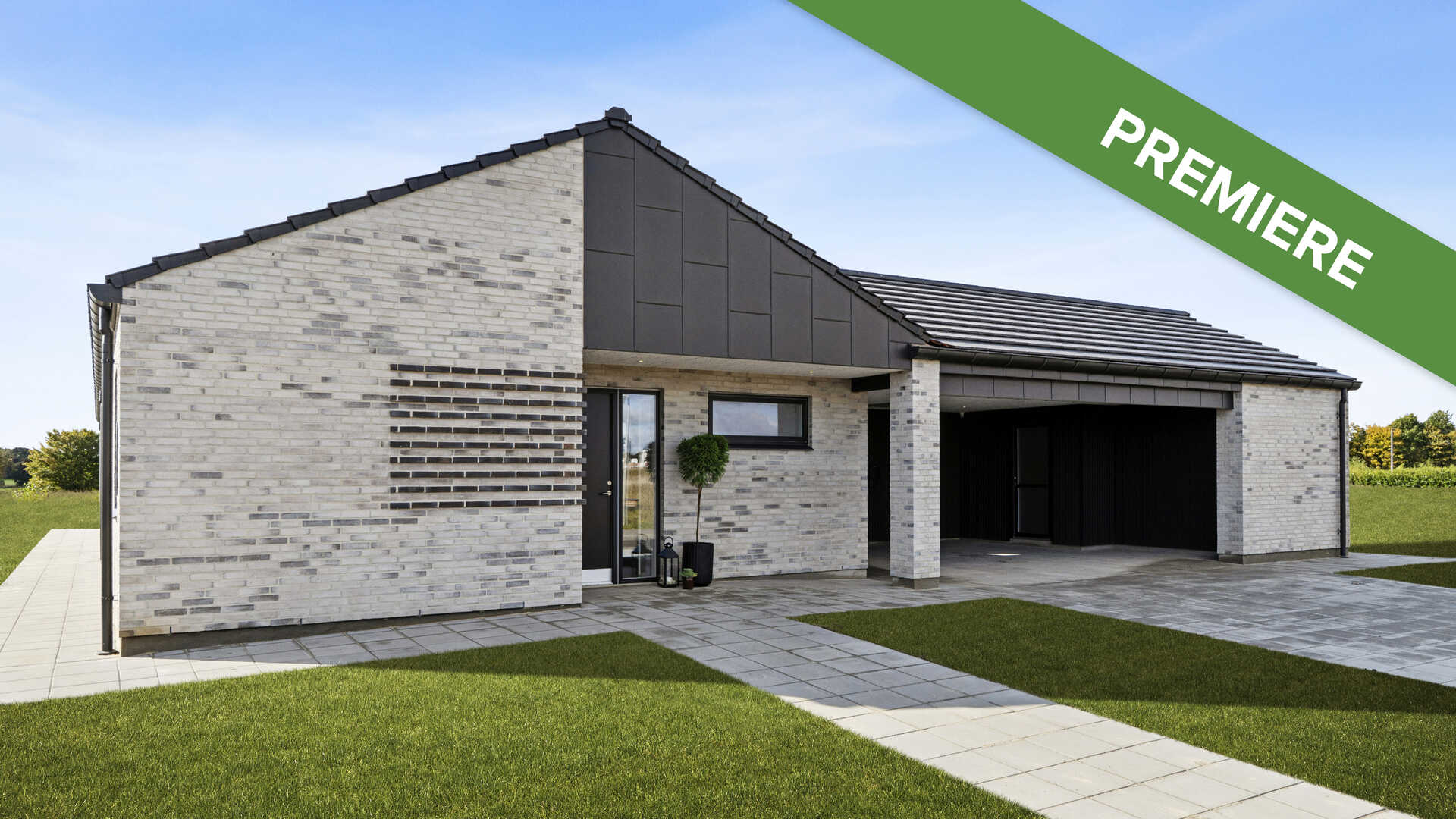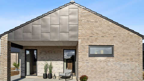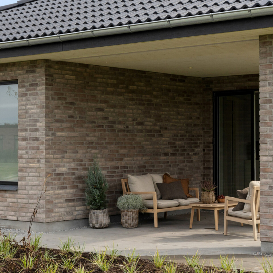Den moderne parcel byder på gode udvendige detaljer som smuk reces i murværket, praktisk niche i carporten til renovationsspande, overdækket indgangsparti integreret med carporten samt en skøn overdækket terrasse.
