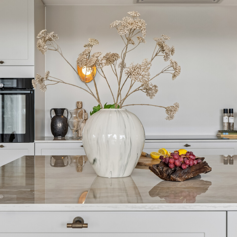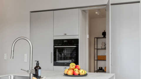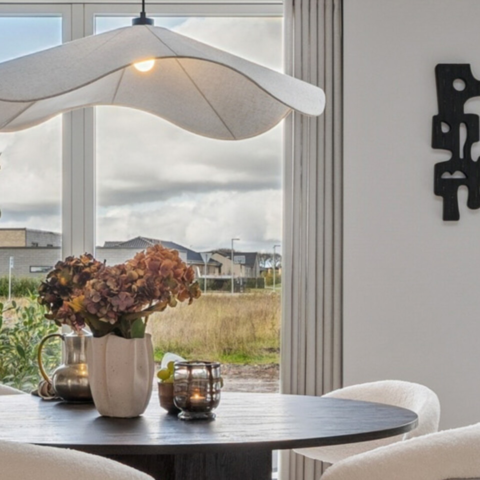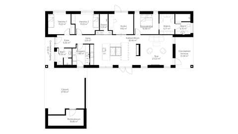 Her mødes man af et overdækket indgangsparti, der åbner op til husets entré og et fint langt kig gennem hele huset. Det store køkken-alrum ligger badet i dagslys fra både ovenlysvinduer og vinduespartierne og som husets hjerte ligger det som det helt naturlige samlingspunkt. Der delvist åbent mod stuen og med newyorker parti til kontoret, er der rig mulighed for at være tæt på hinanden selvom man ikke er i samme rum.