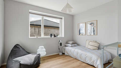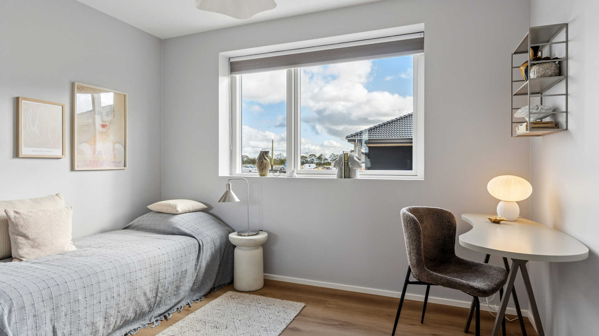 Husets voksenafdeling rummer et godt soveværelse, stort walk-in og badeværelse. Med to fine børneværelser med indbygget opbevaring, er huset perfekt for børnefamilien.