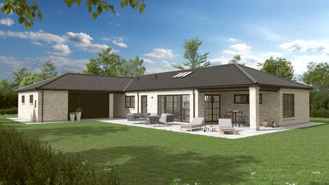 I forlængelse af køkken-alrummet ligger den lyse og rummelige stue, hvor de store glaspartier inviterer haven helt ind i hjemmet og skaber en rolig, afslappet stemning – perfekt til både filmaftener og stille stunder. Forældrene kan trække sig tilbage i deres egen private afdeling med soveværelse og eget badeværelse, hvor der er plads til ro og fordybelse. Huset er gennemtænkt ned til mindste detalje med klare zoner, masser af opbevaringsplads og en planløsning, der understøtter både fællesskab og privatliv. Et moderne lavenergiparcelhus fra HusCompagniet, skabt til et liv med plads, lys og nærvær.