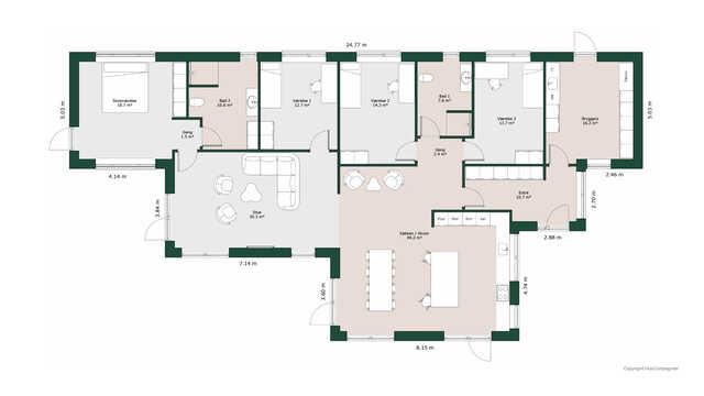 Husets hjerte er det store køkken/alrum, hvorfra der er adgang til et godt depot, stuen og husets separate værelsesafdeling, hvor entréen og det store bryggers også ligger. Bemærk, hvordan det tværgående køkken/alrum giver lysindfald fra to sider, ligesom H-huset skaber nogle helt unikke uderum med gårdmiljø, hygge- og lækroge med kig til have igennem husets store vinduespartier, der giver et fantastisk lysindfald.