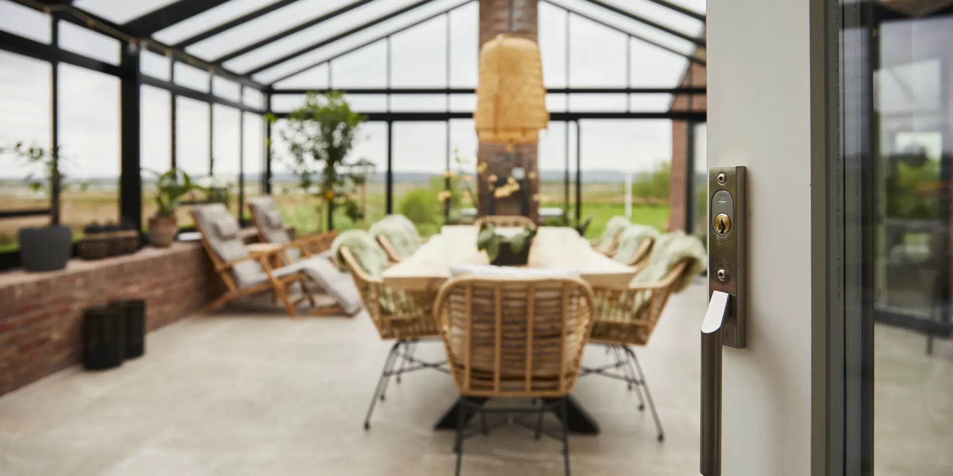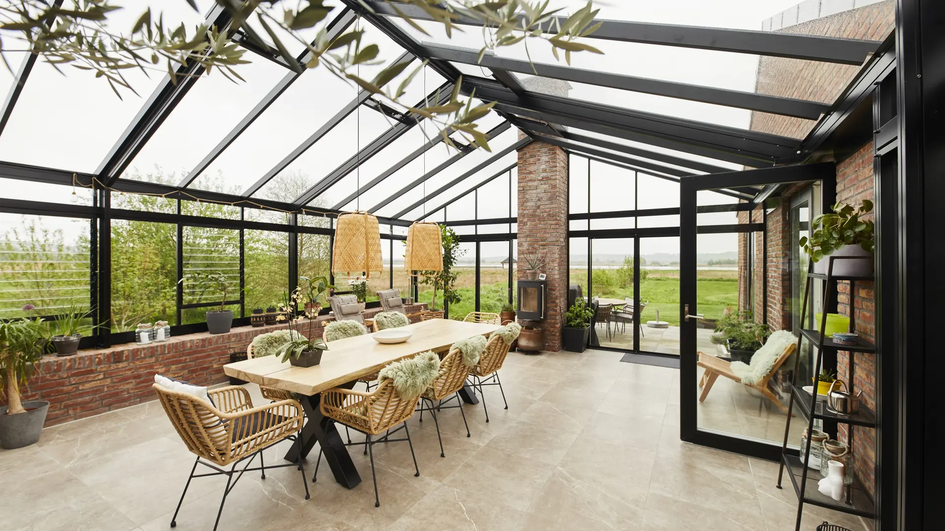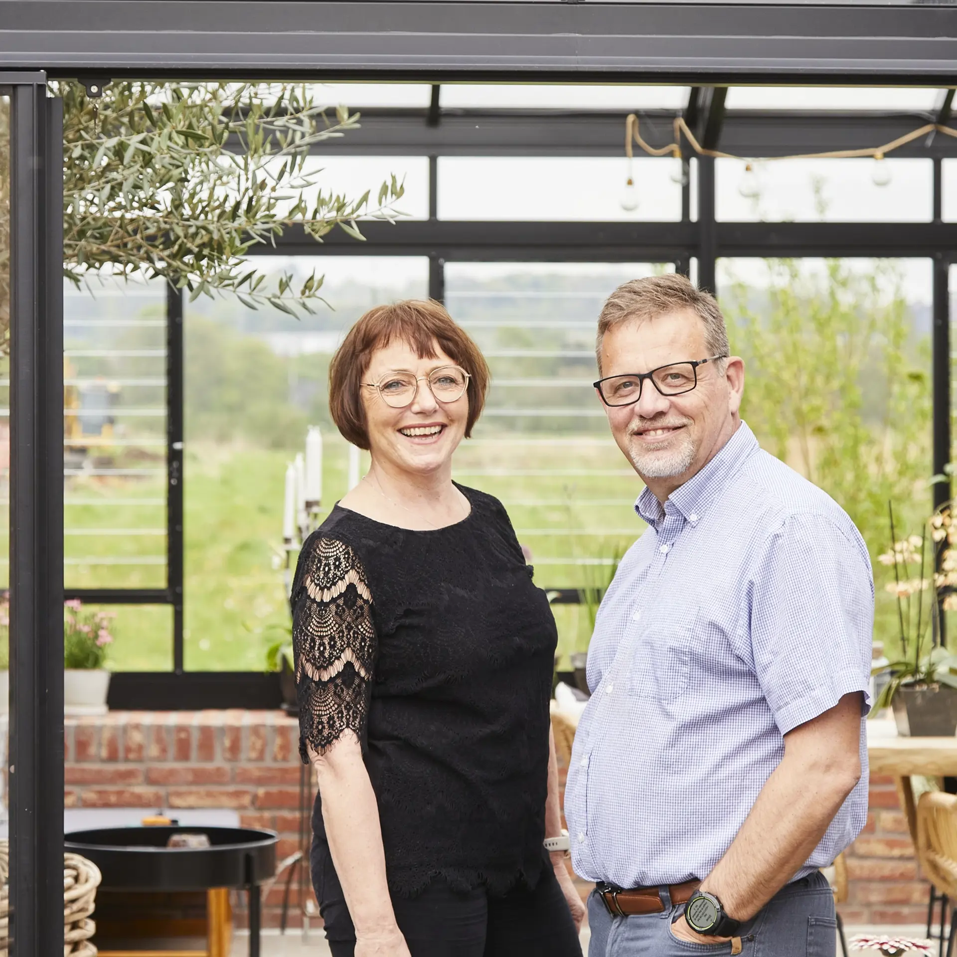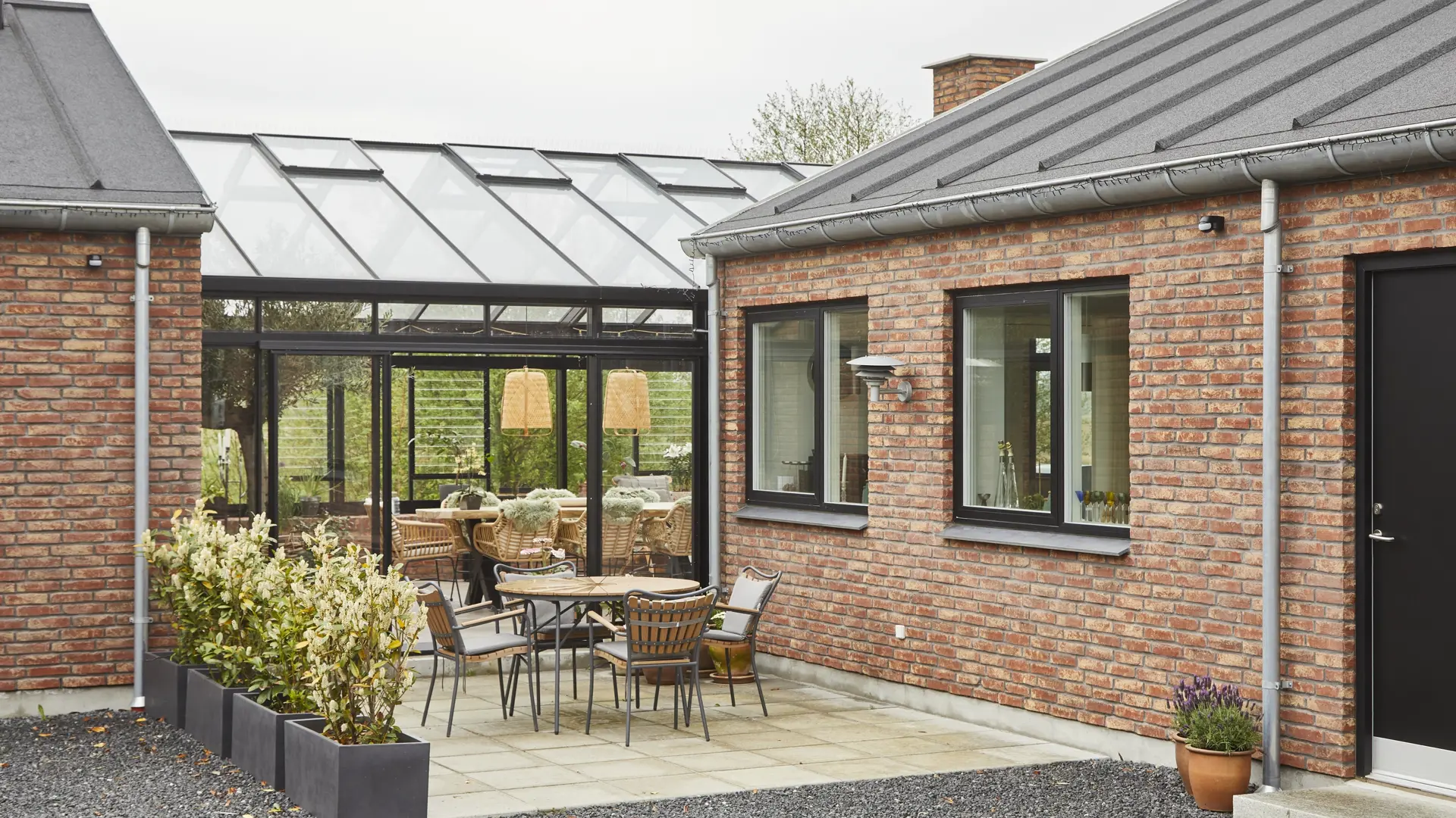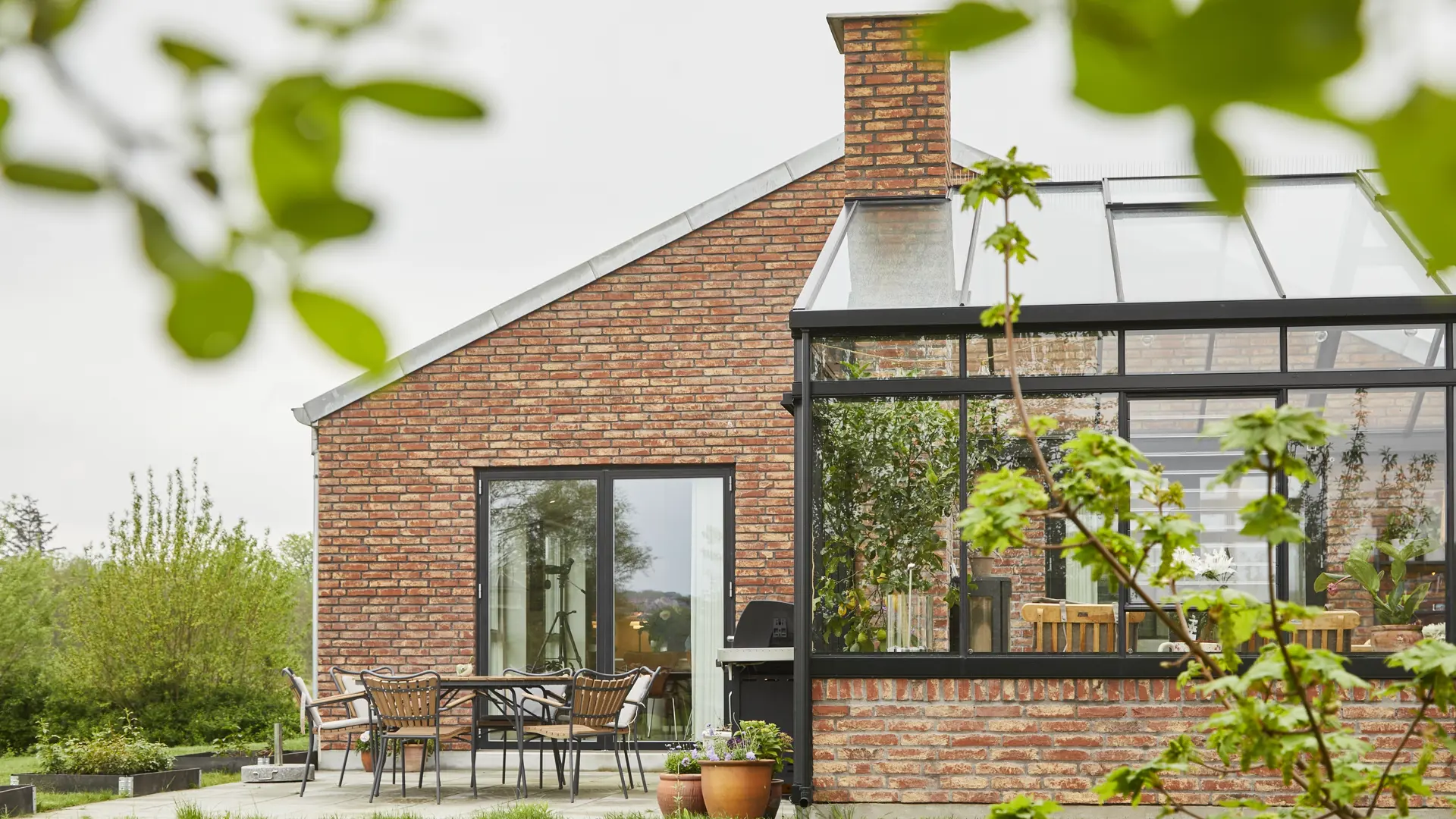 Vores orangeri med gulvvarme er vores yndlingsrum – vi nyder at opholde os derude i 8-9 måneder om året.