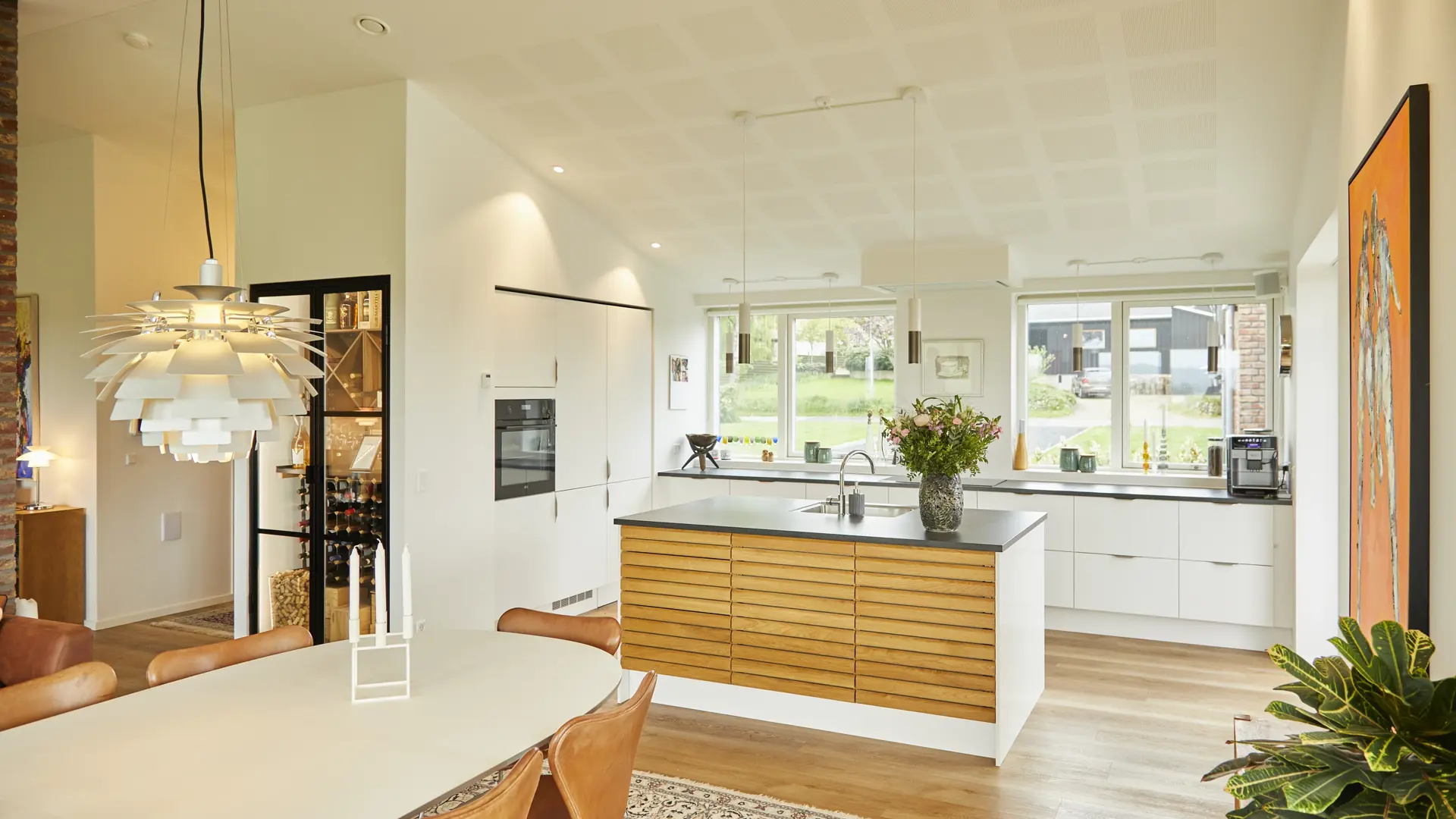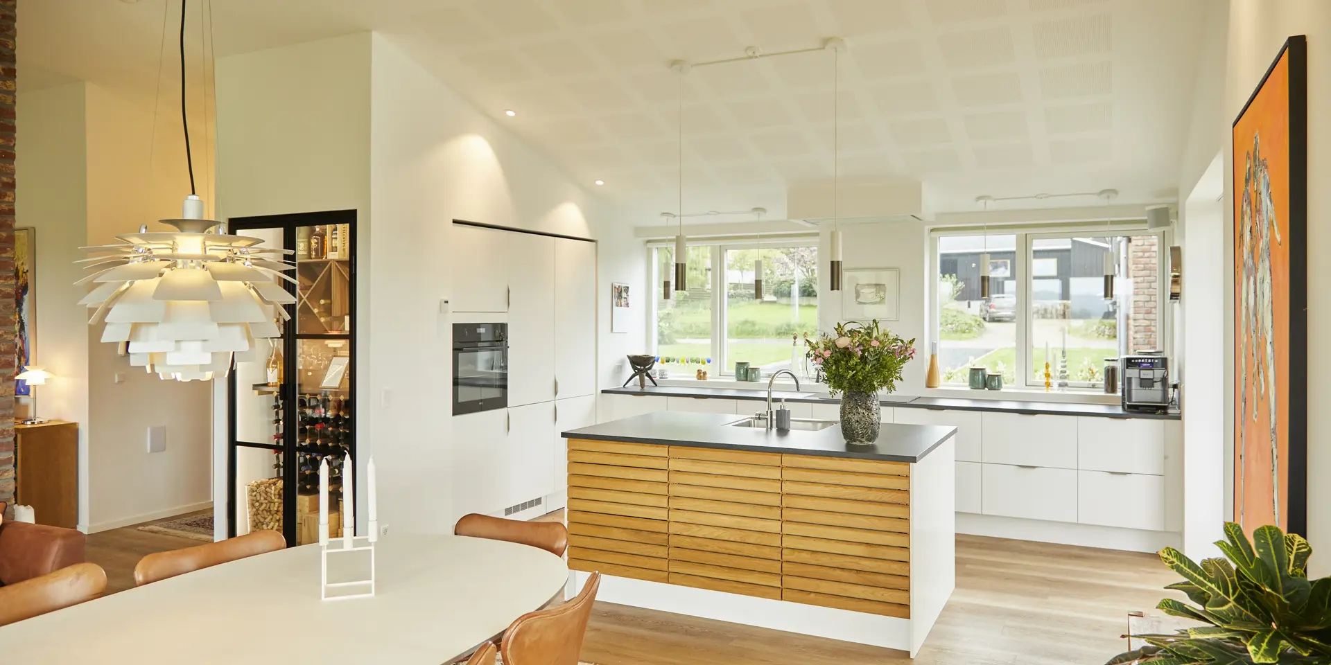 Det er skønt, at vi har fået udnyttet og optimeret kvadratmeterne helt optimalt og effektivt i hele huset. Vi har f.eks. minimeret gangarealer og i stedet lagt kvadratmeterne, der hvor vi lever og har samtidig fået masser af indbygget opbevaringsplads.