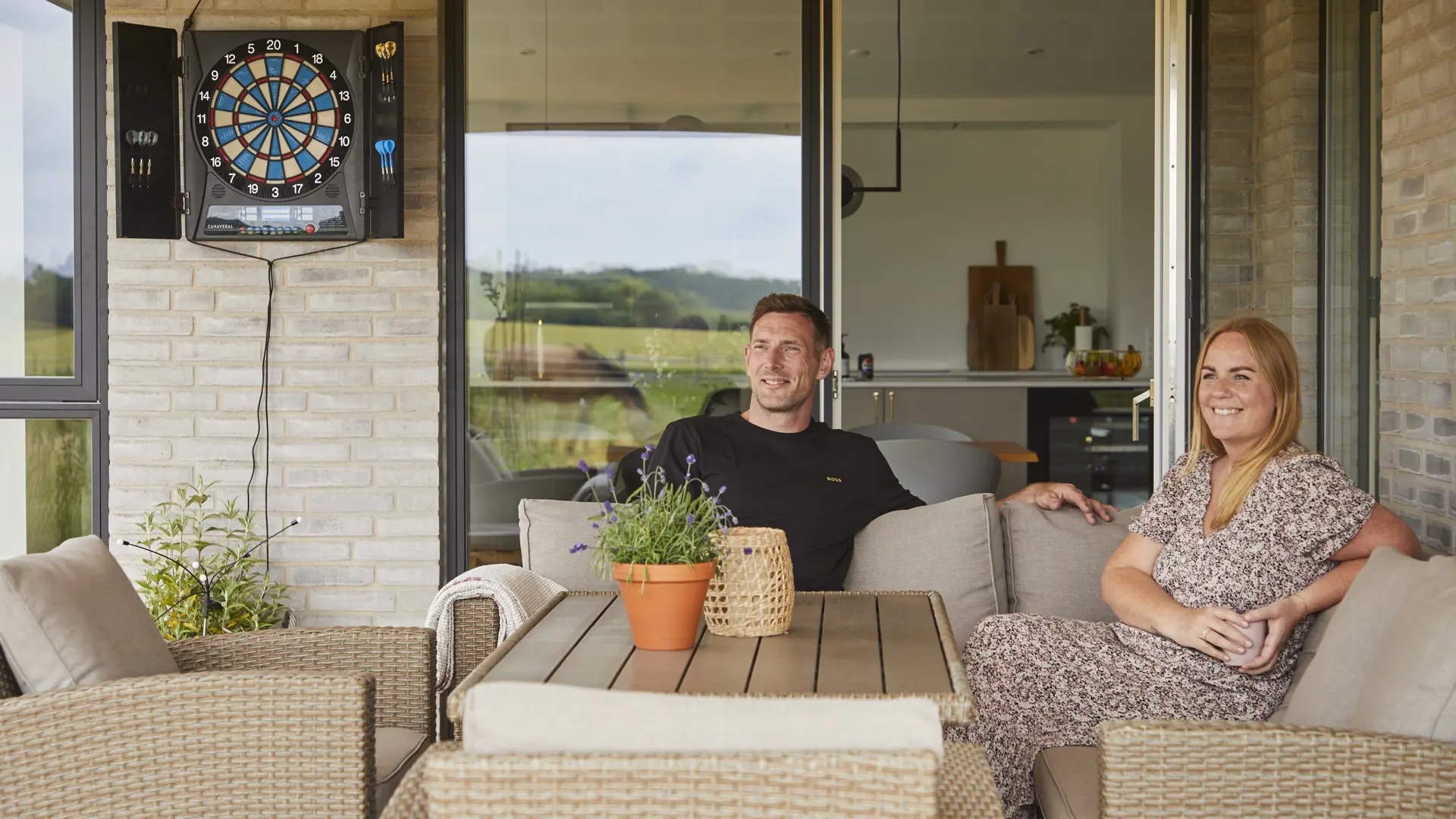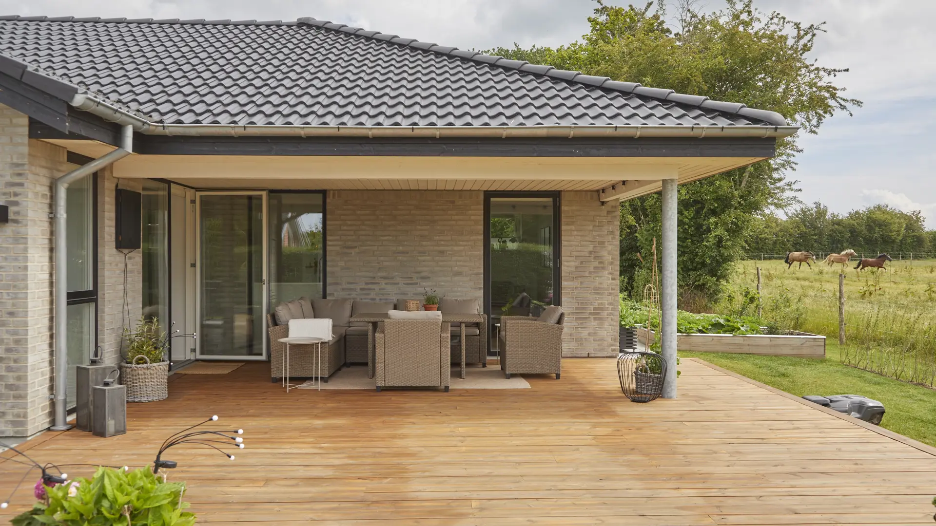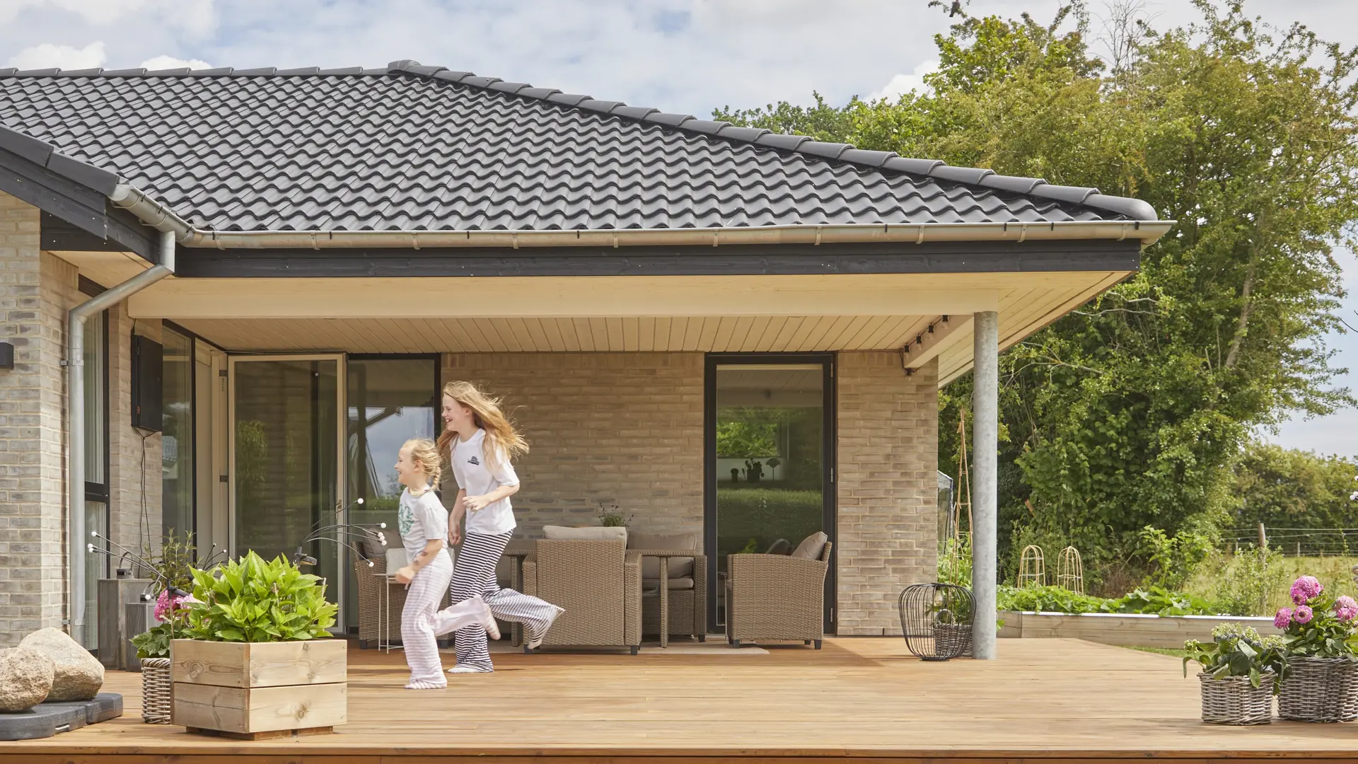 Tina og Jacob har bygget en klassisk parcel på 170 m² med en overdækket terrasse og udsigt til skov og marker.