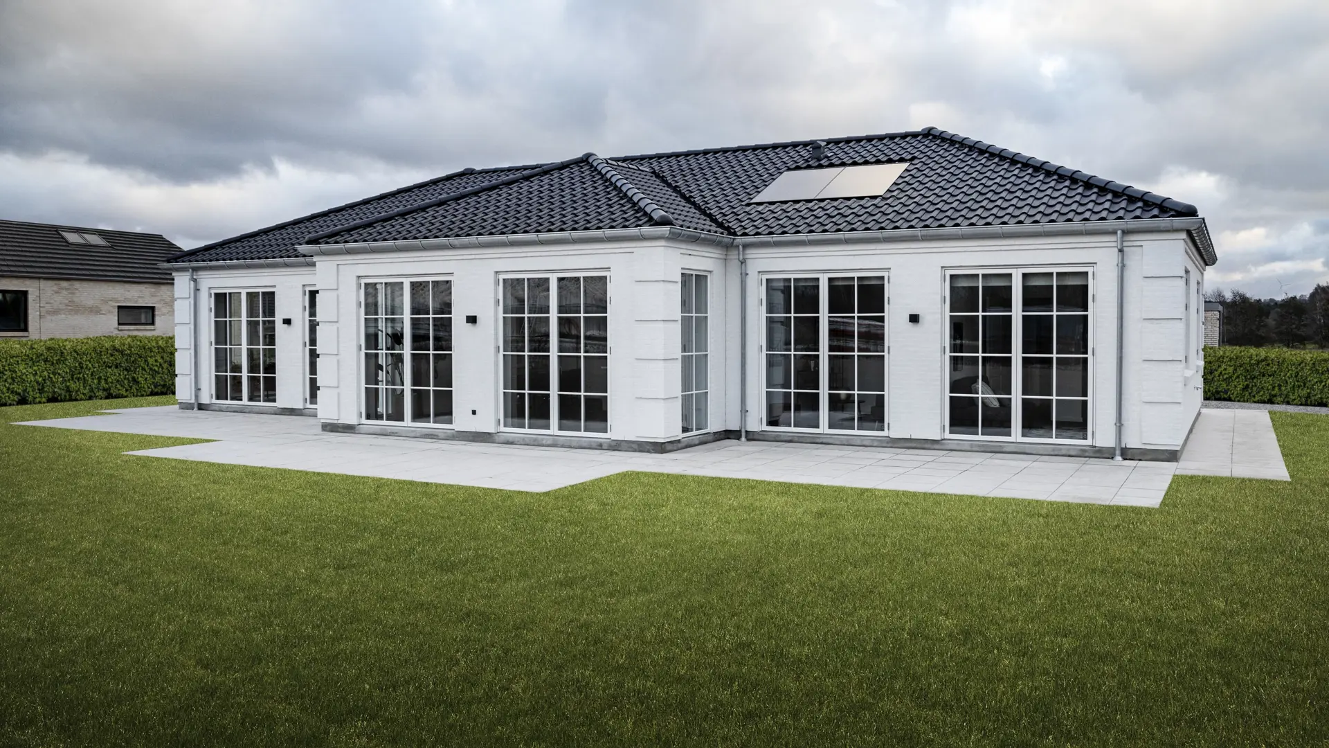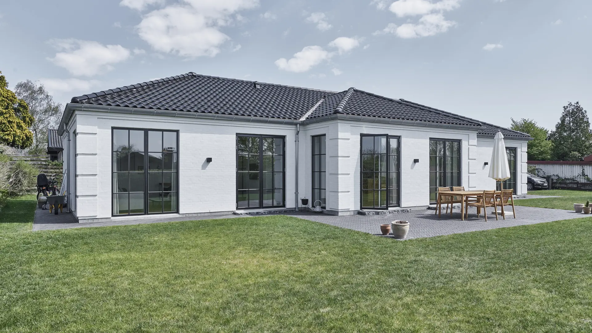 De hvide facader, det sorte tag og de mange vinduer og døre giver huset et eksklusivt og indbydende udtryk. Indvendigt oplever I højt til loftet, elegante fyldningsdøre, klassisk træarbejde og mulighed for detaljer som sildebensgulve og paneler, der fuldender den herskabelige stemning.